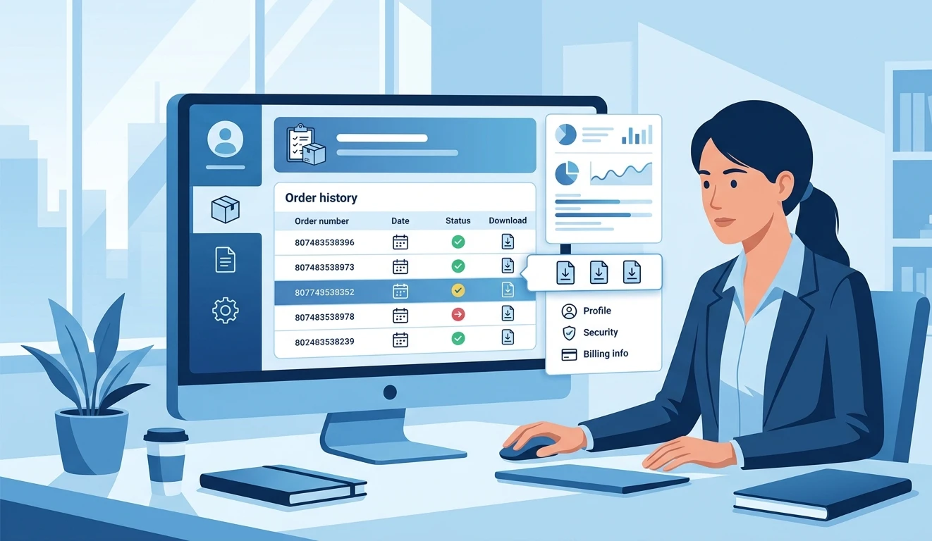 Zákaznický portál je jiný typ nástroje s jiným účelem. Není navržen pro objevování, ale pro správu. Jeho používateľ je existující zákazník, který se prihlásí s konkrétním záměrem: chce vidět stav své objednávky, stáhnout fakturu, zadávat opakovanou objednávku podle historie, zkontrolovat zůstatek kontokorentu nebo nahlásit reklamaci.