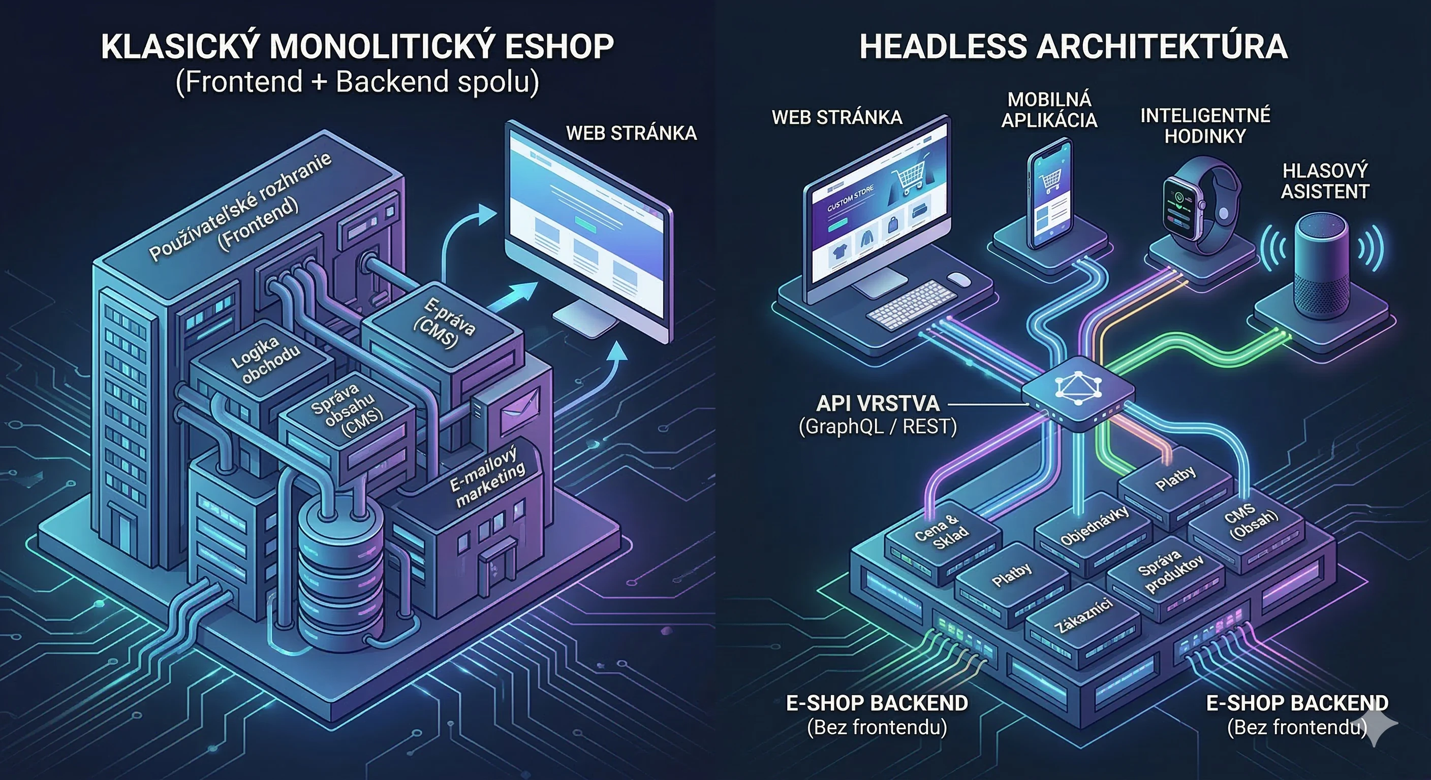 Váš eshop nestíha rásť? Každá zmena na webe trvá týždne a mobilný zážitok zaostáva? Headless architektúra oddeľuje frontend od backendu a dáva vám slobodu, rýchlosť a škálovateľnosť, o akej ste s klasickým eshopom mohli len snívať.