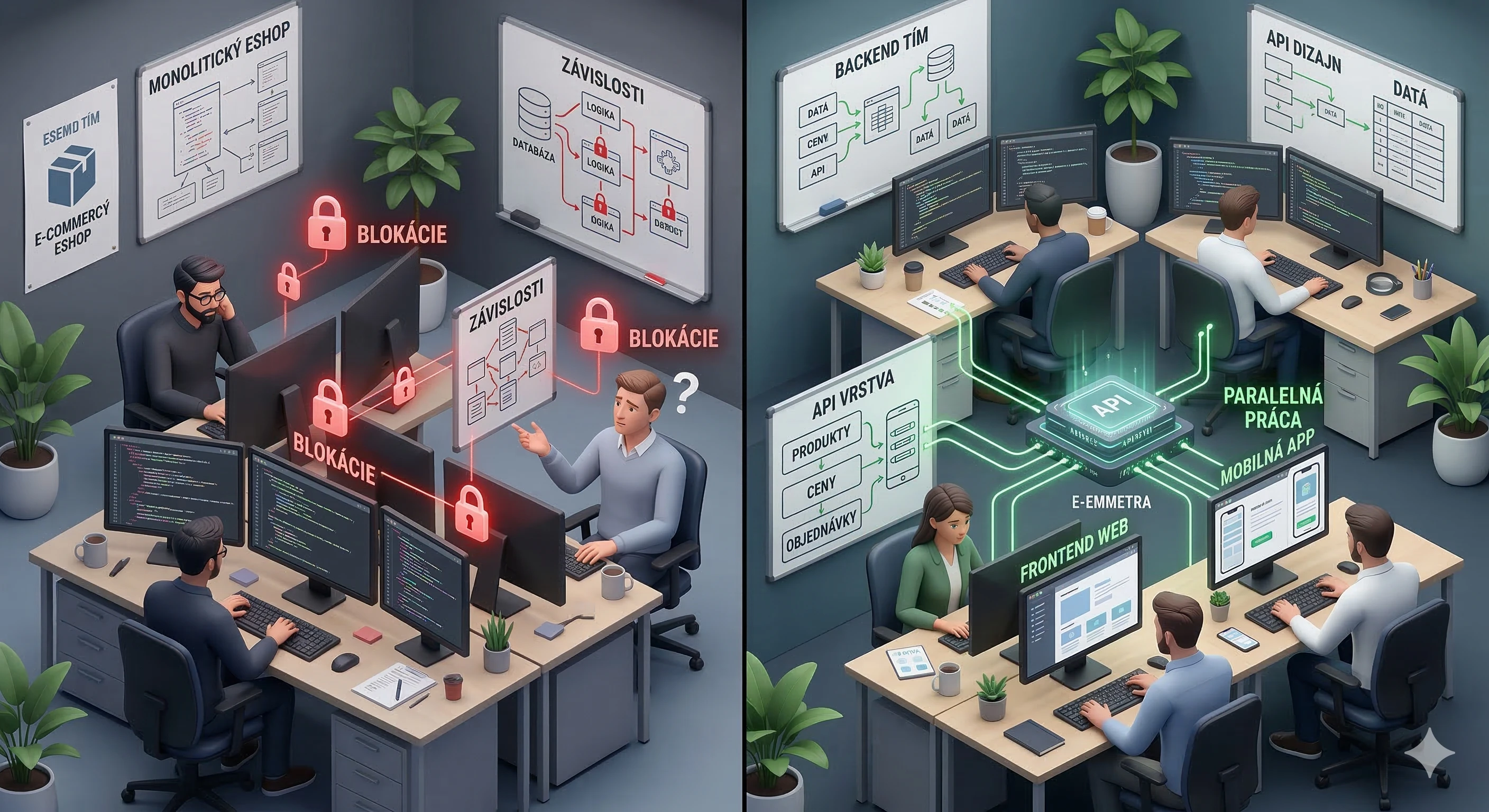 Výsledok: vývojári môžu pracovať na dizajne a UX bez rizika, že rozbijú obchodnú logiku. Marketingový tím môže meniť obsah bez čakania na programátorov. A ten istý backend dokáže zásobovať dátami nielen web, ale aj mobilnú aplikáciu, kiosk v predajni alebo hlasového asistenta.