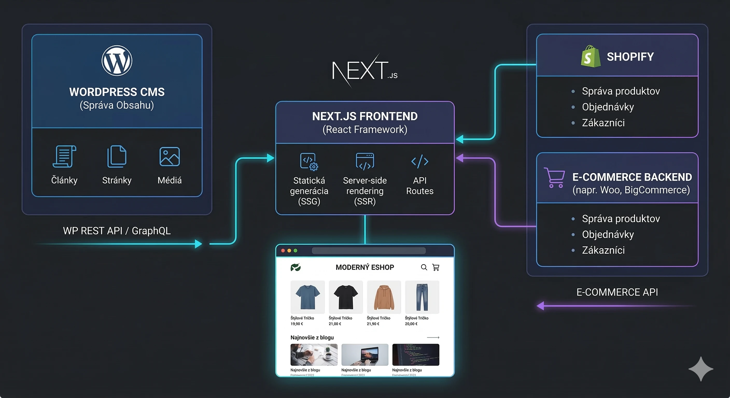 Pre plnohodnotný ecommerce backend sa headless WordPress kombinuje s riešeniami ako Shopify (cez Storefront API), Medusa.js (open source) alebo Saleor, ktoré zabezpečujú obchodnú logiku, platby a správu objednávok.