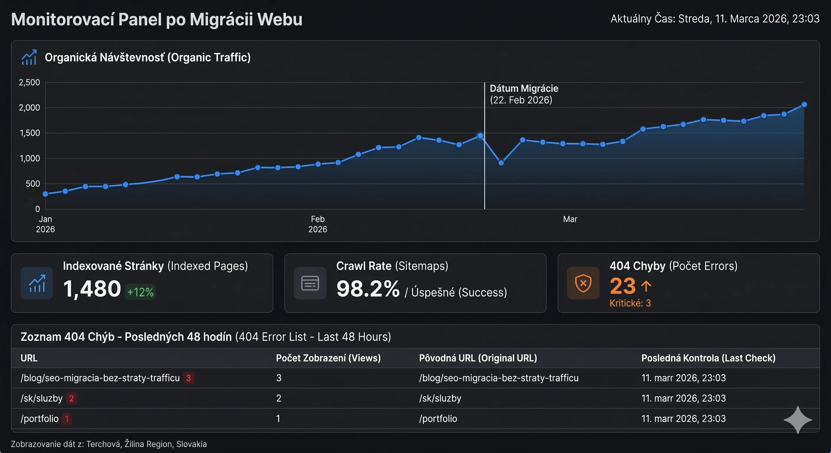 Mierne výkyvy v prvých dňoch po redizajne sú normálne. Ak pokles nepresiahne 10 % a trvá menej ako týždeň, nemusí ísť o vážny problém. Google potrebuje čas na precrawlovanie a indexáciu nových stránok. WebFX Ak však traffic po troch týždňoch stále výrazne klesá, znamená to, že niečo v migrácii zlyhalo a treba konať okamžite.