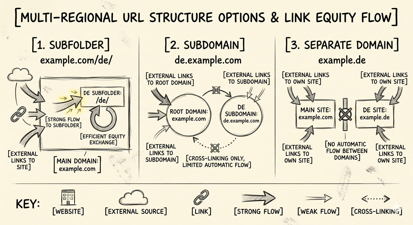 Pri samostatných expansion storoch musíte SEO pre každý trh budovať úplne separátne. Backlinky z nemeckých médií, ktoré smerujú na example.de, nepomáhajú vášmu example.com. Pri Markets prístupe je situácia opačná.