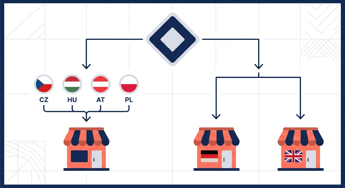 Firma B — distribútor techniky so slovenským, nemeckým a britským trhom. Nemecko má vlastný tím, iný sortiment a lokálneho finančného partnera. UK potrebuje separátnu platobnú entitu post-Brexit. Tu je správne rozhodnutie: slovenský a česky trh cez Markets, Nemecko a UK ako expansion stores.