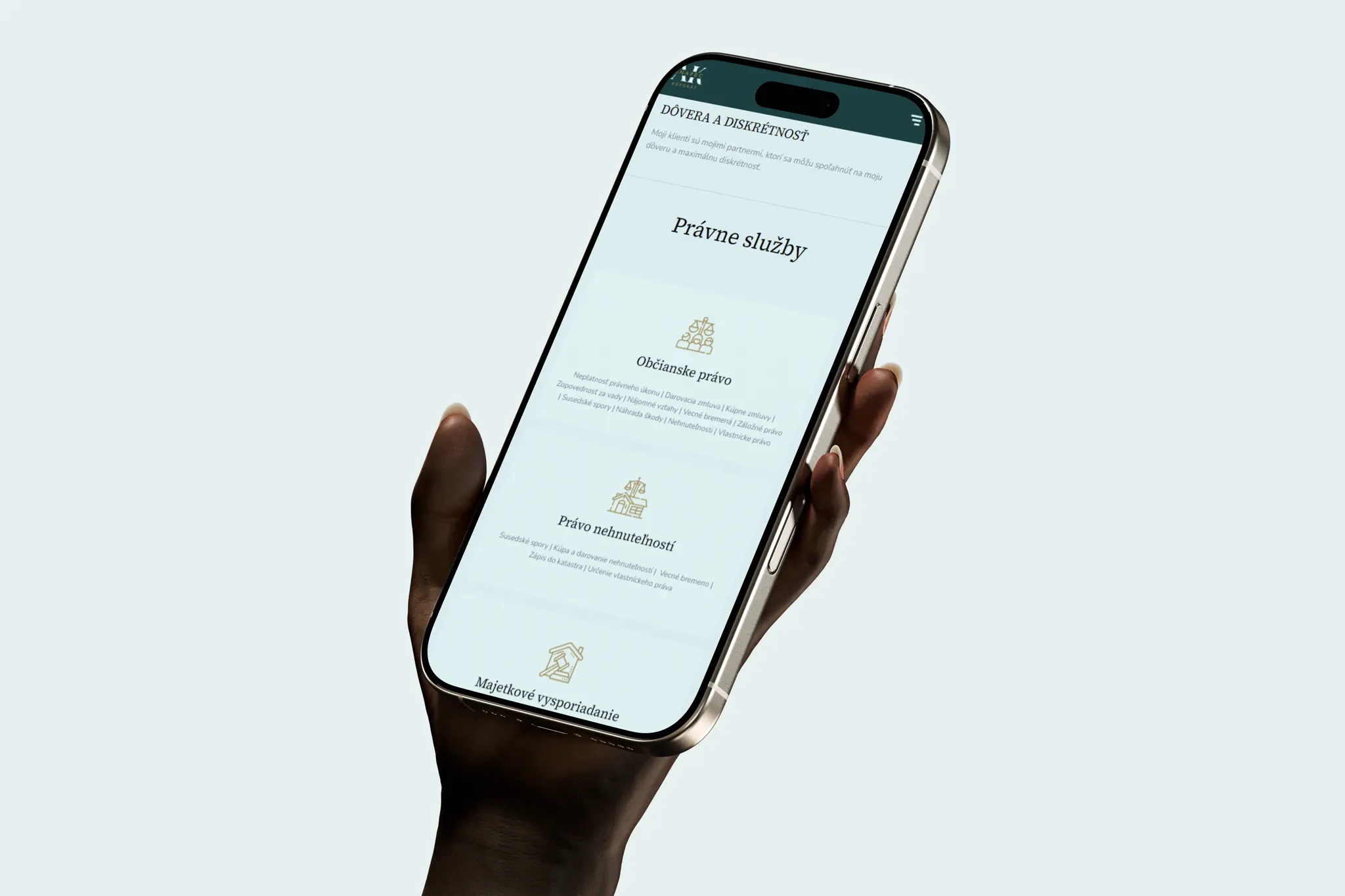 Celý web je prispôsobený tomu, ako reálny človek hľadá právnu pomoc. Návštevník potrebuje za pár sekúnd pochopiť, či advokát rieši jeho typ problému. Potrebuje jasný kontakt a možnosť rýchleho spojenia bez zbytočných krokov. Potrebuje cítiť dôveru a profesionalitu ešte predtým, než niekomu zavolá. A potrebuje sa orientovať intuitívne aj na mobile, pretože väčšina ľudí hľadá právnika práve z telefónu. Týmto potrebám je prispôsobený každý prvok na stránke, od štruktúry menu po umiestnenie kontaktných tlačidiel.