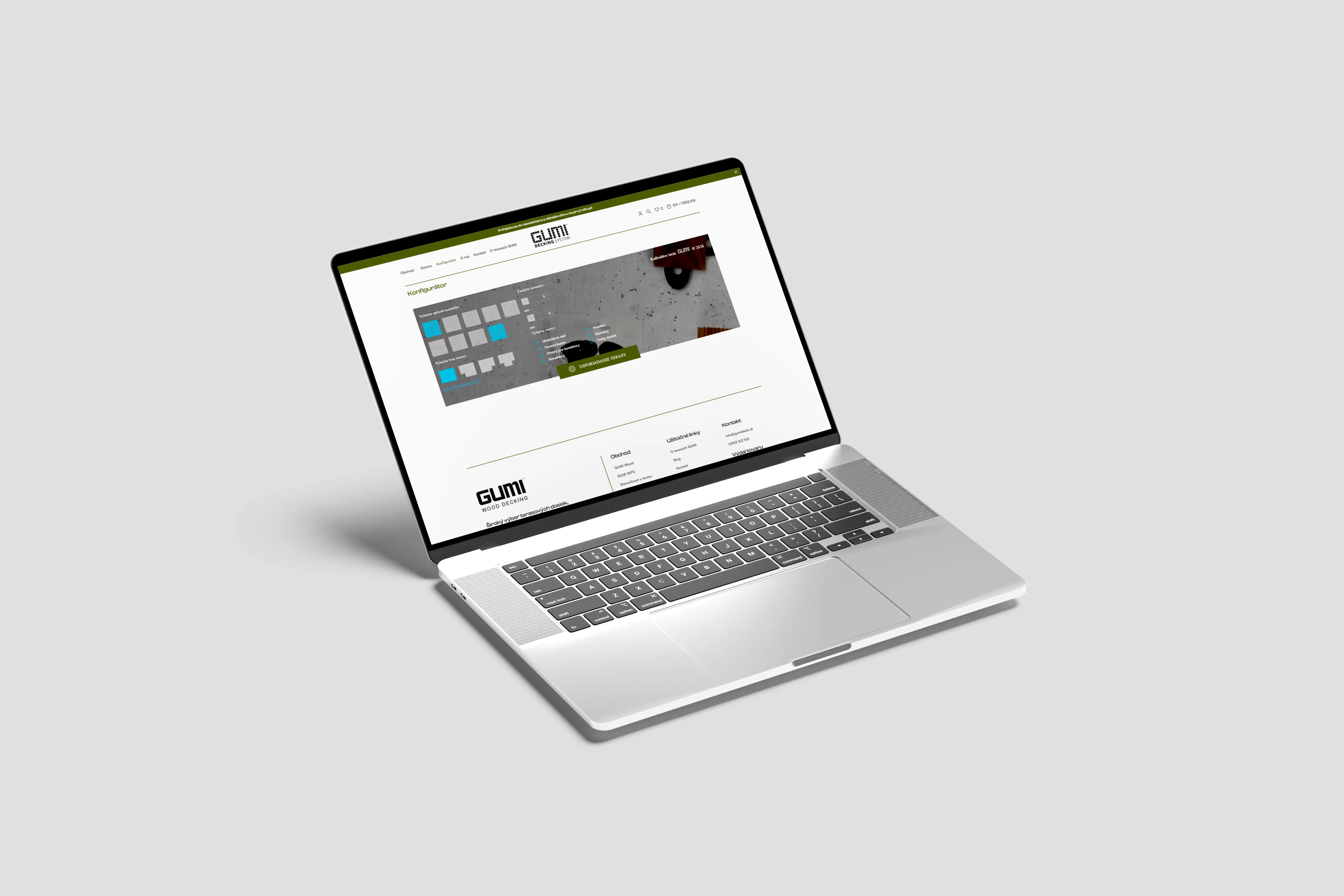 Pre Gumideck sme vytvorili prezentačnú webstránku pre inovatívny terasový systém GUMI, ktorý umožňuje montáž drevenej terasy bez rezania, vŕtania a odpadu. Okrem klasickej prezentácie produktu sme vyvinuli inteligentnú online kalkulačku, kde návštevník po zadaní rozmerov okamžite vidí presný počet dosiek, príslušenstva a celkovú cenu. Web edukatívnym štýlom vysvetľuje technológiu, porovnáva GUMI s tradičnými riešeniami a privádza návštevníka ku kalkulácii alebo objednávke v prepojenom eshope.